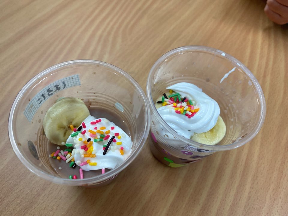生クリームやチョコスプレー、バナナをを入れて飾りつけをします!