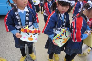 全園児がかわいい豆入れを下げて整列しました。