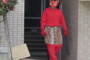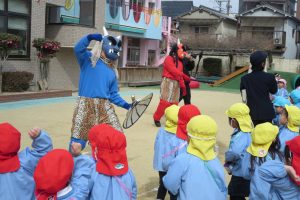 みんなで、まめを投げてやっつけます。