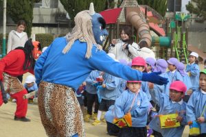 前に出て、豆を投げる子、…