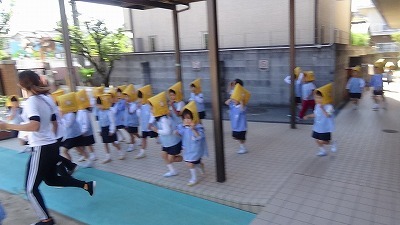 幼稚園では、地震が起こったという想定で避難訓練を行いました。