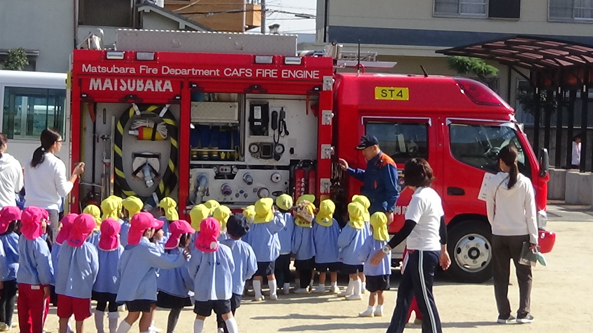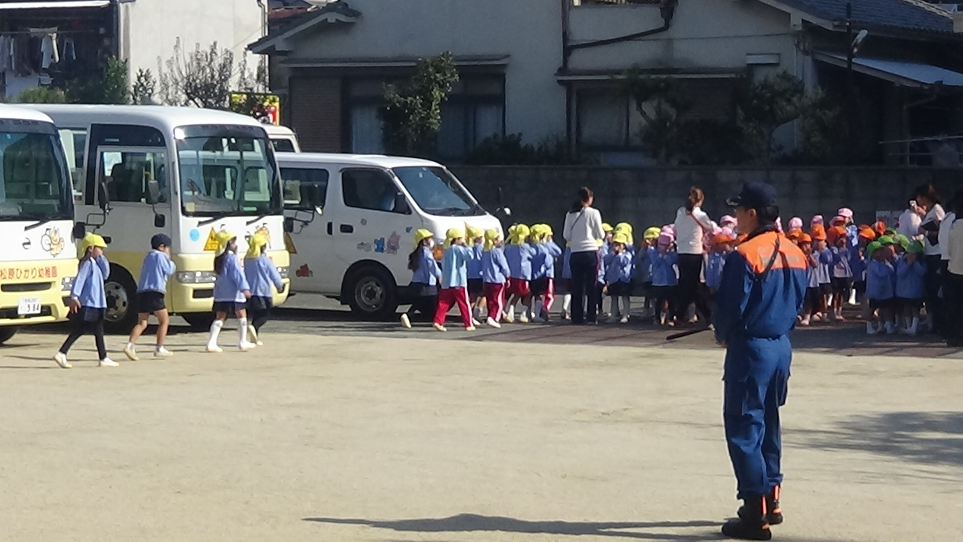 連休明けのすがすがしい秋晴れの中、全園児避難訓練を行いました。