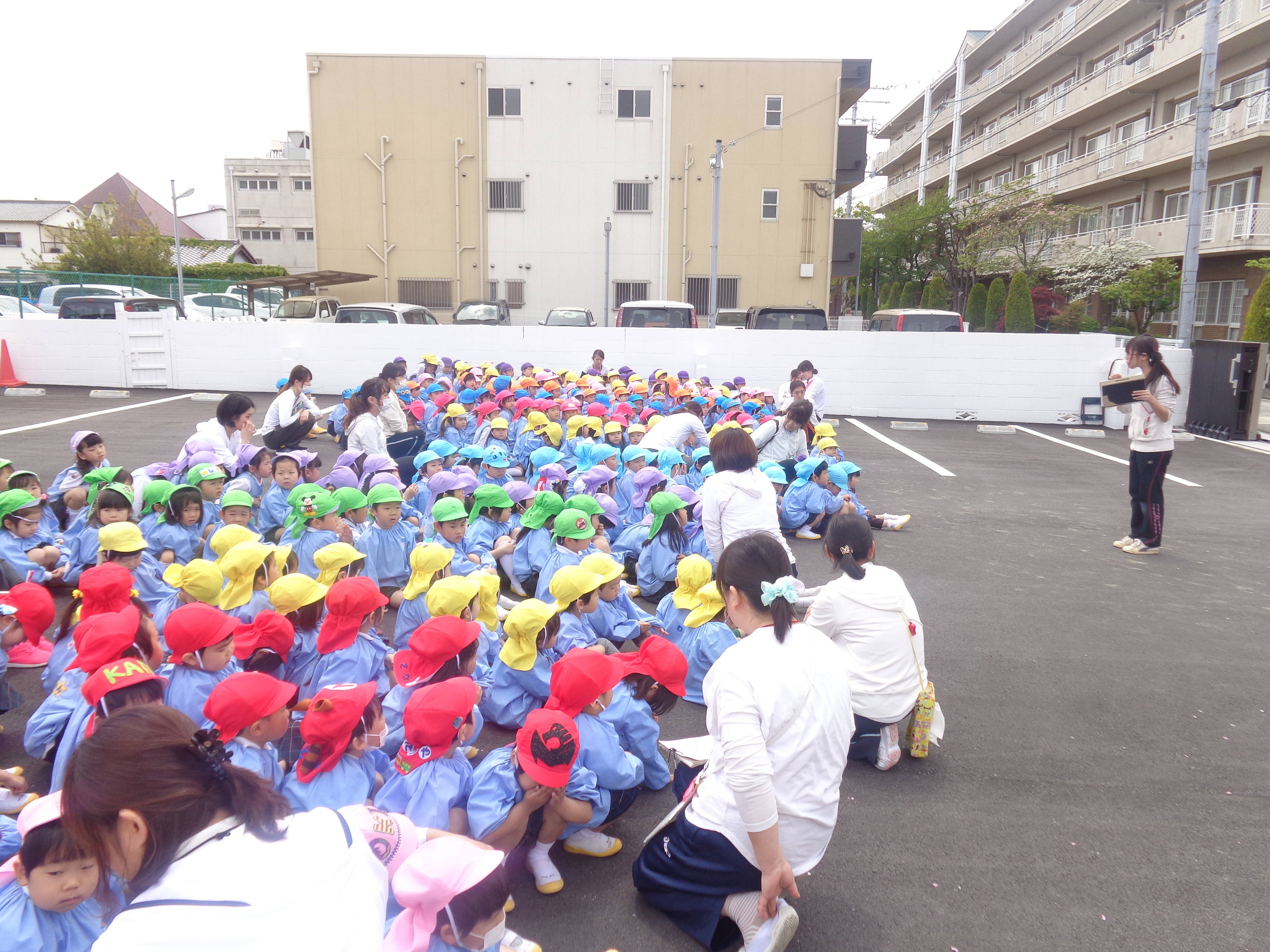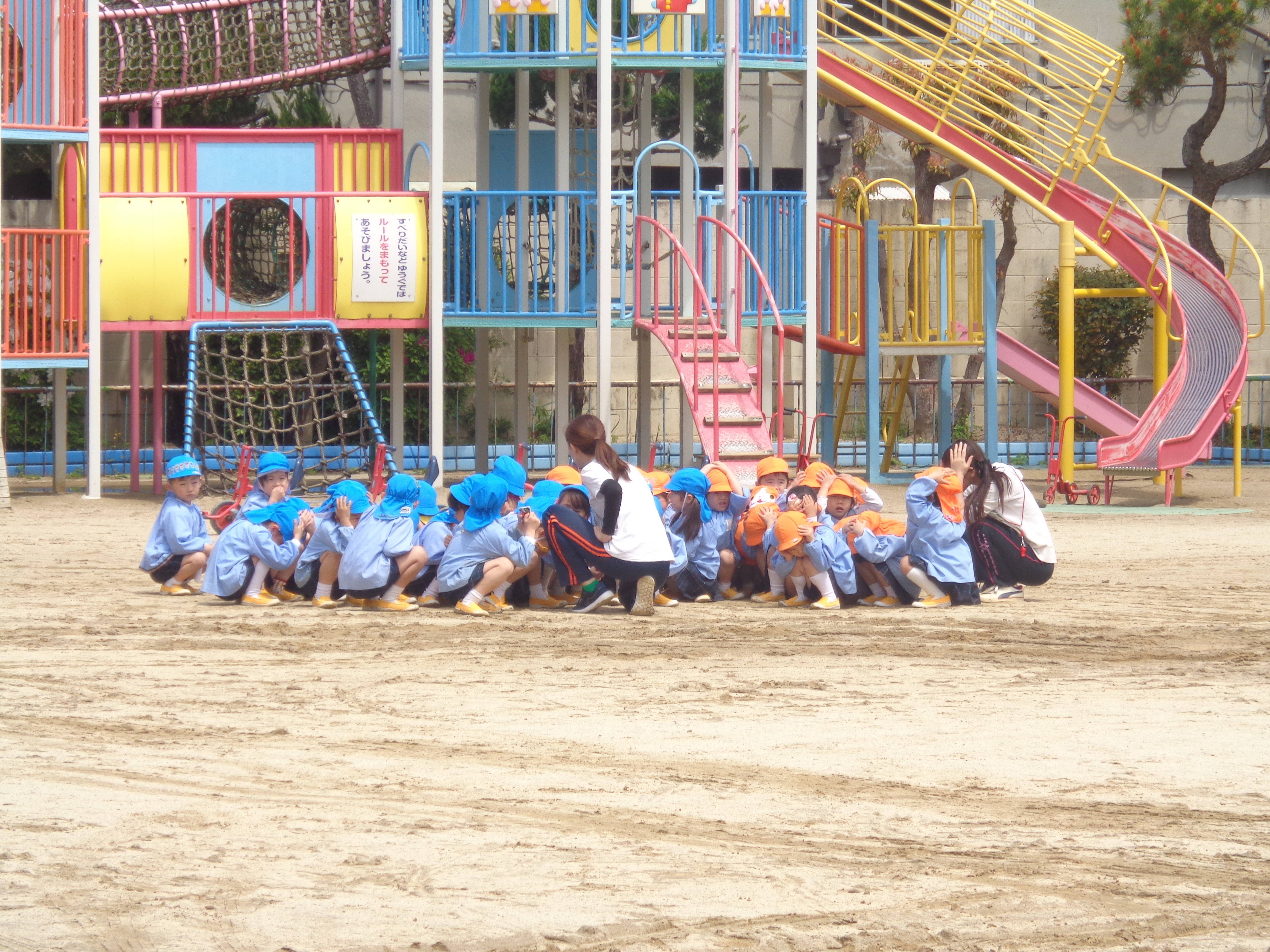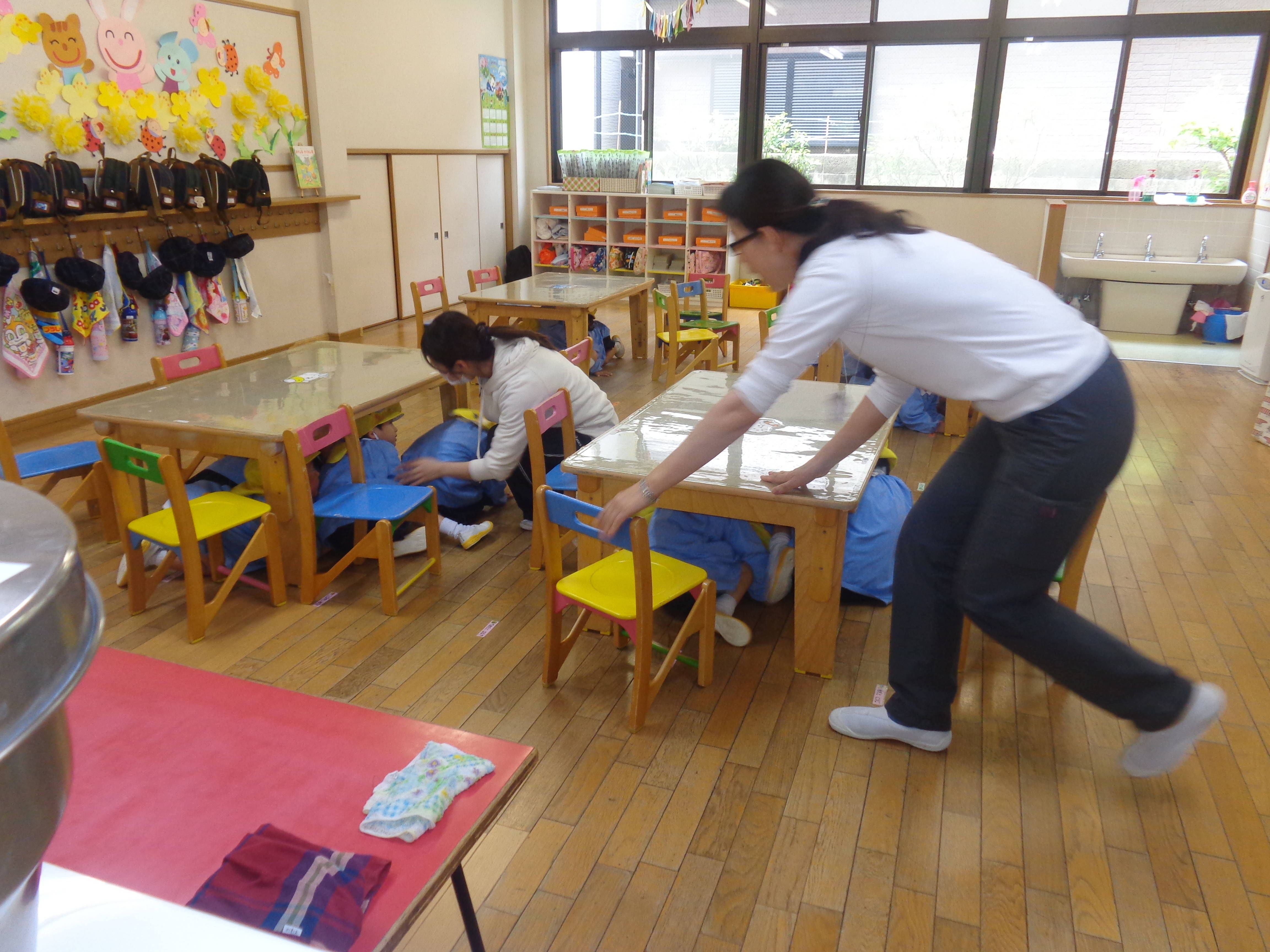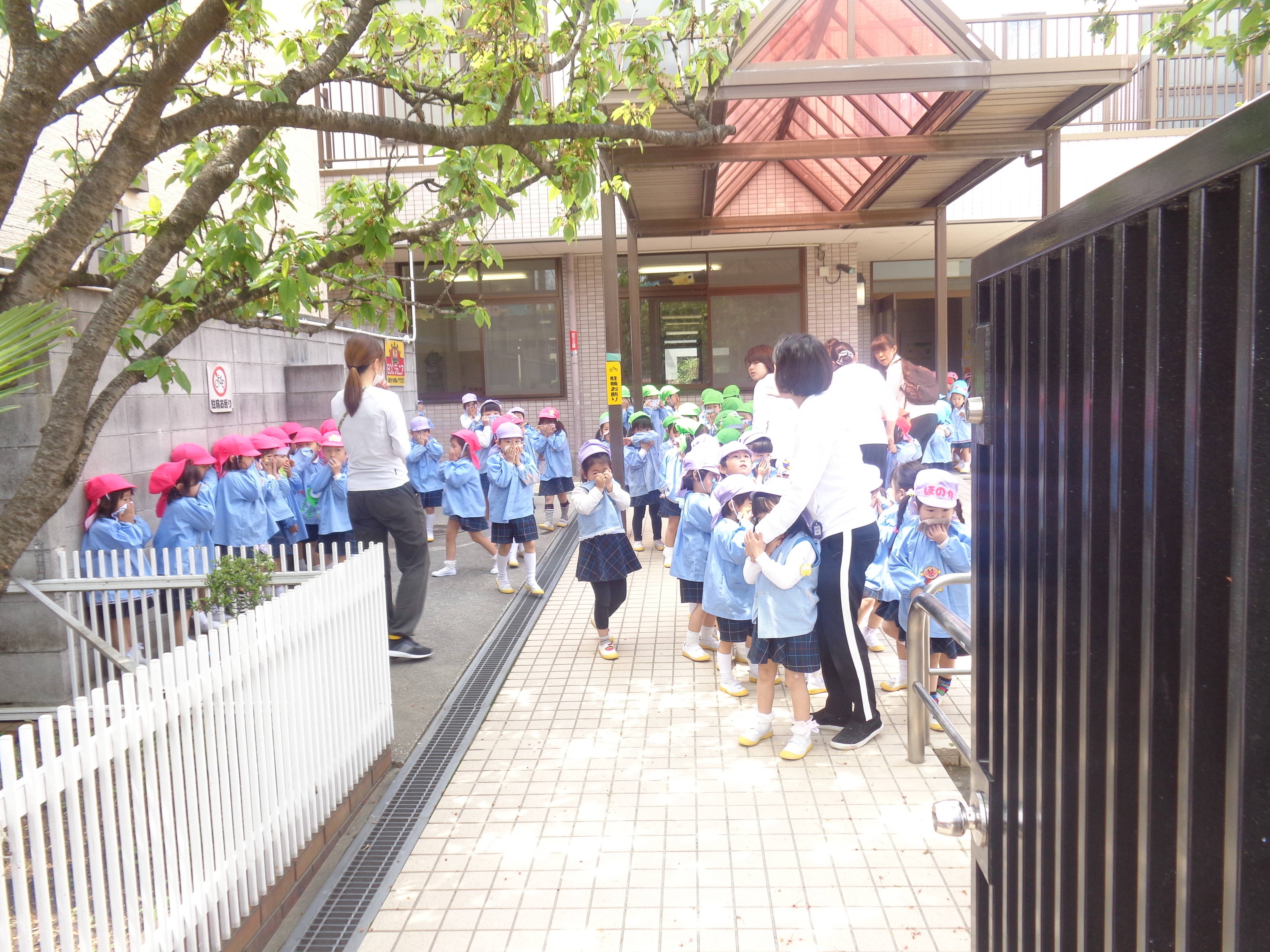 避難訓練がありました(^u^) 2017/04/27 今日は避難訓練がありました(^u^) 保育室で先生のお話を聞いて、 ’お’おさない ’か’かけない ’し’しやべらない ’も’もどらない の、合言葉を教えて頂きました☆ まずは地震が起こった時の訓練で机の中に隠れ、次に火事の訓練で、口をハンカチで覆い、園の駐車場まで避難しました☆ 初めての避難訓練でドキドキしている子ども達もいましたが、みんなとっても上手に避難できました(^—^) お家でも、いざという時にどうするのかを、話し合ってみてくださいね(*^_^*)