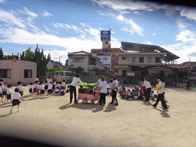 揺れがおさまったあと、つぼみ組さんもカートに乗り避難できました。