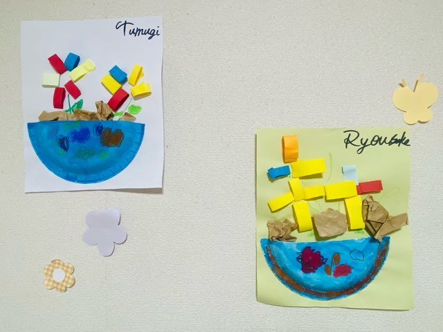 紙皿に絵の具を塗ったり、お花紙を丸めたり、画用紙を切ったり・・・