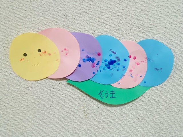 イモムシの体は指スタンプでペタペタ…ポンポン…感触を楽しみました♪♪