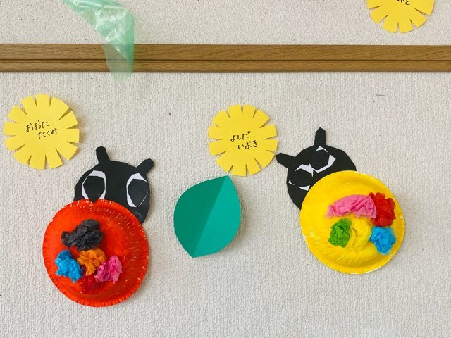 てんとう虫の顔はクレパスで描きました。年少さんが描く、このほわんとした表情が可愛いですね!!