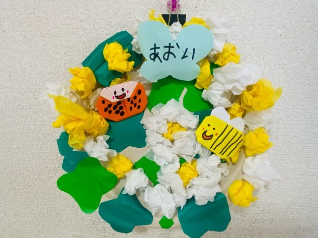 お花紙を使ってたんぽぽを作りました。くしゃくしゃ“丸める”という活動は、みんな集中していくつもいくつも丸めていました!!(;'∀')