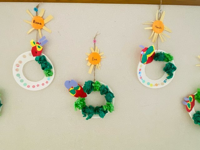 絵本を読んで、紙皿とお花紙ではらぺこあおむしを作りました。