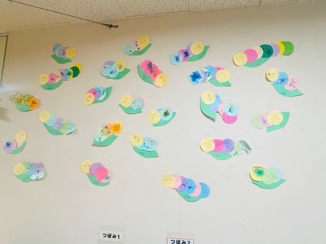イモムシさんの体をのりで上手にぬりぬりして繋げました。