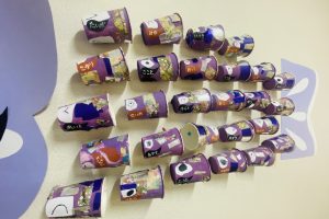 紙コップでこいのぼりを作りました!紙コップにクラスカラーをぬって目とひげと鱗を貼りました!子どもたちは目の表情をこだわって作っていたのでこいのぼりの表情にご注目下さい!