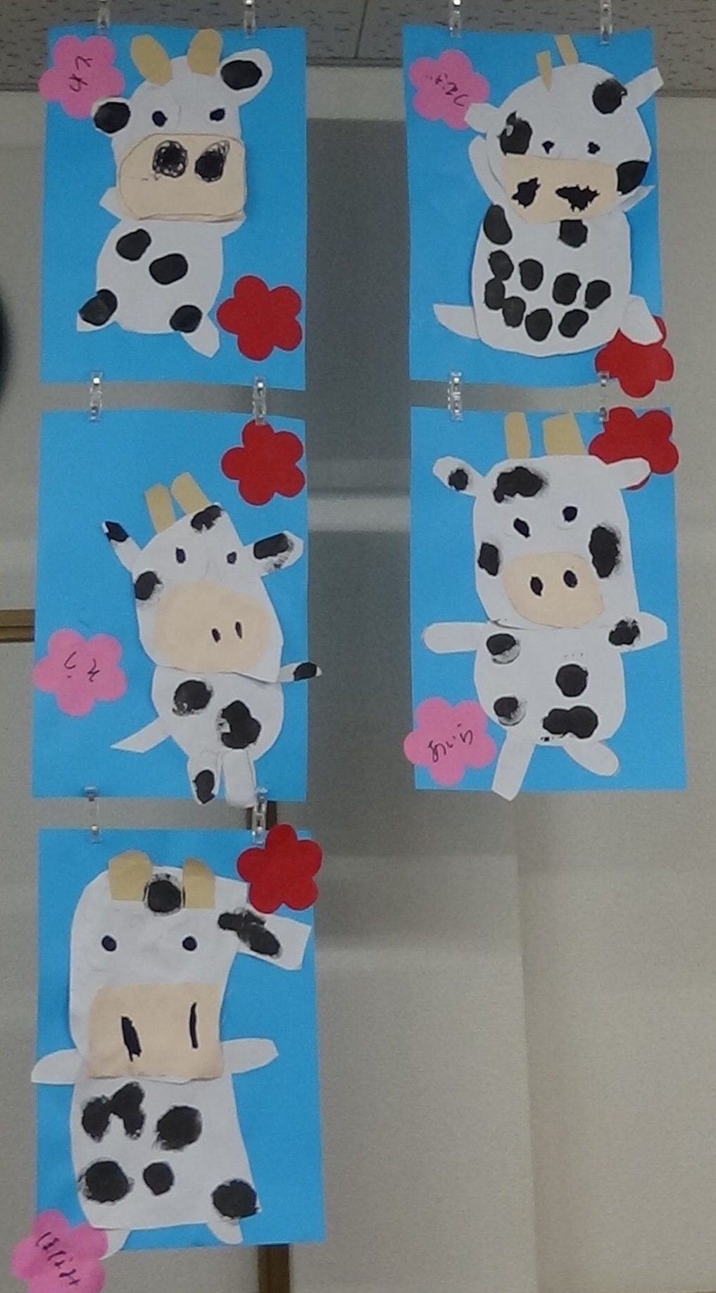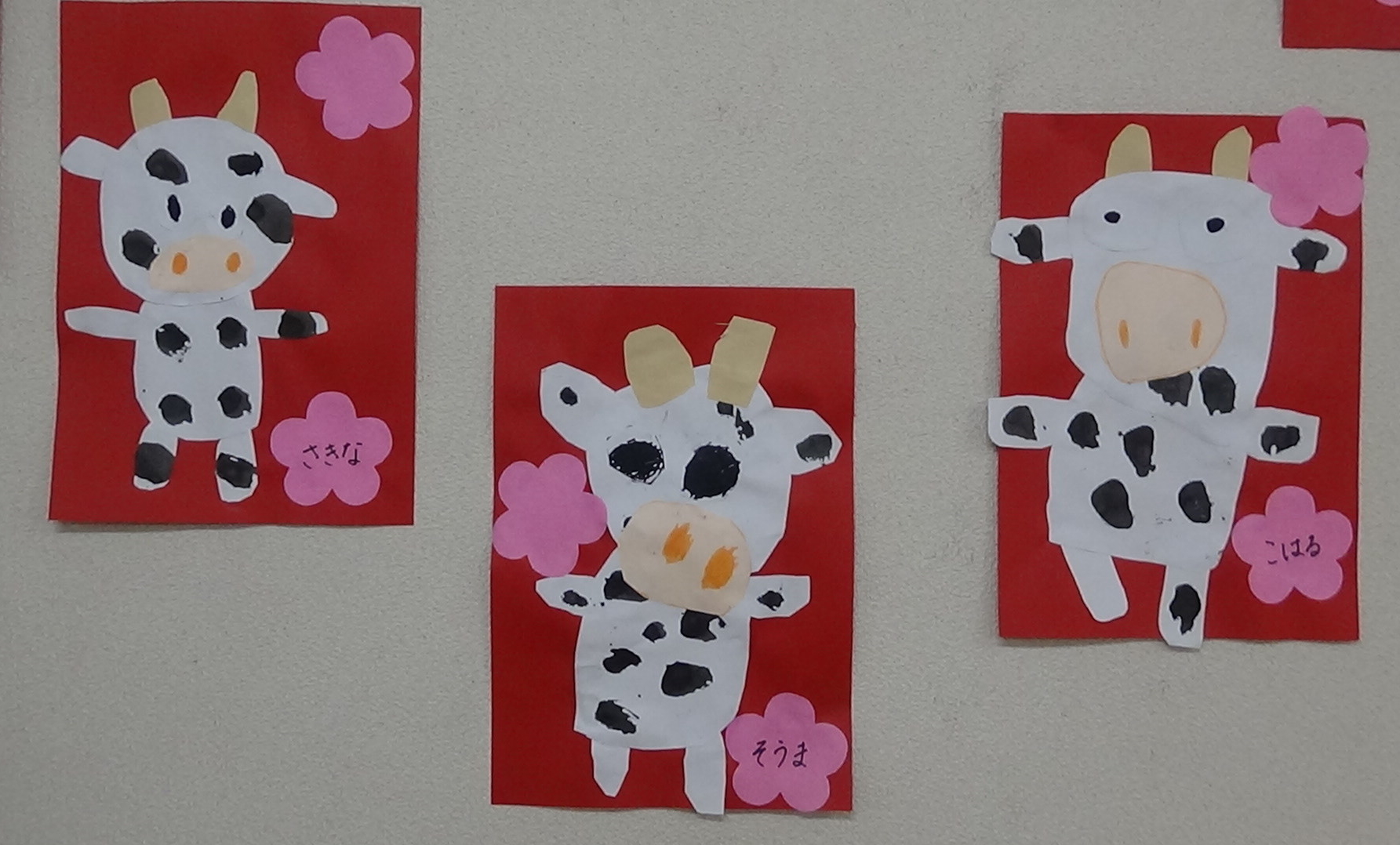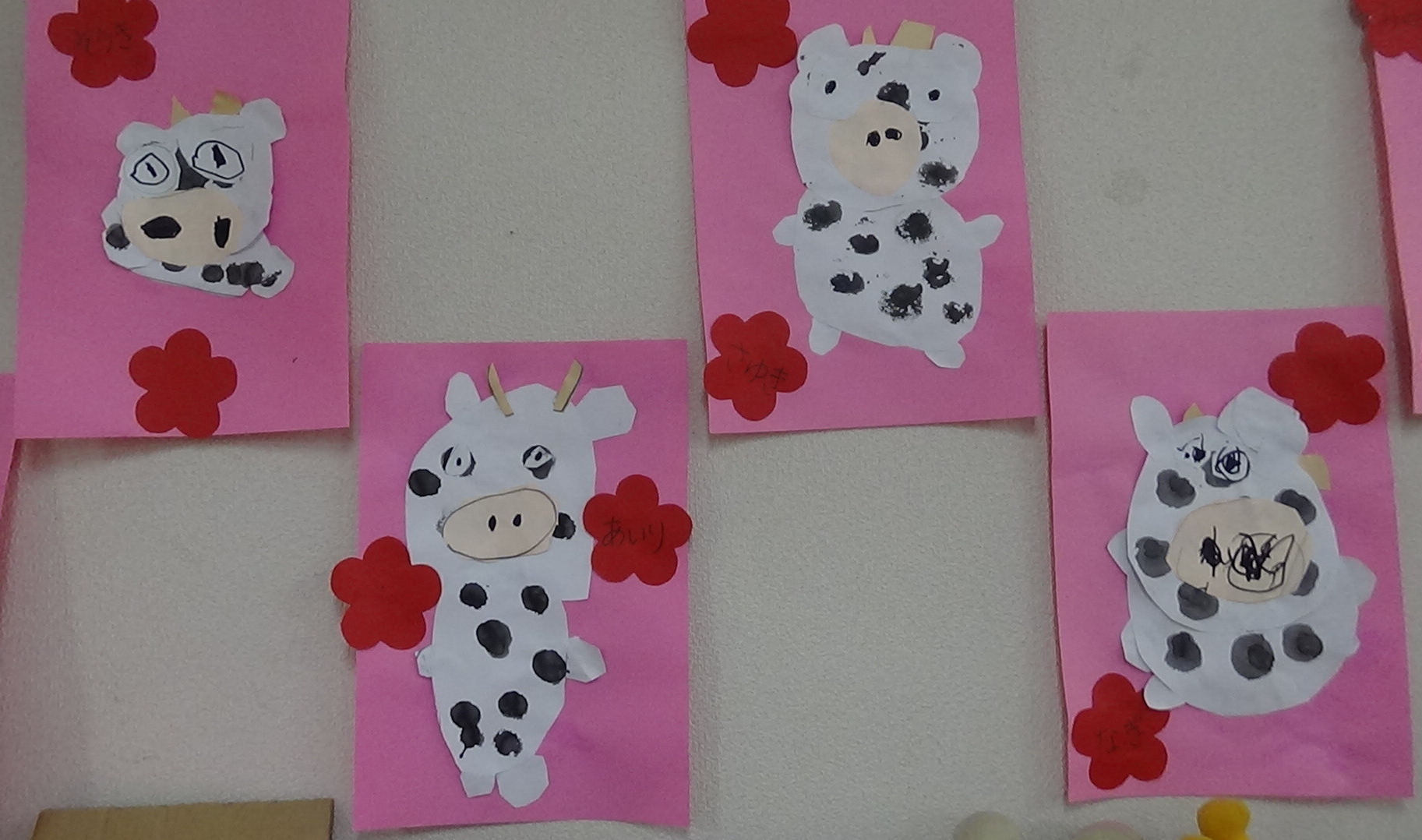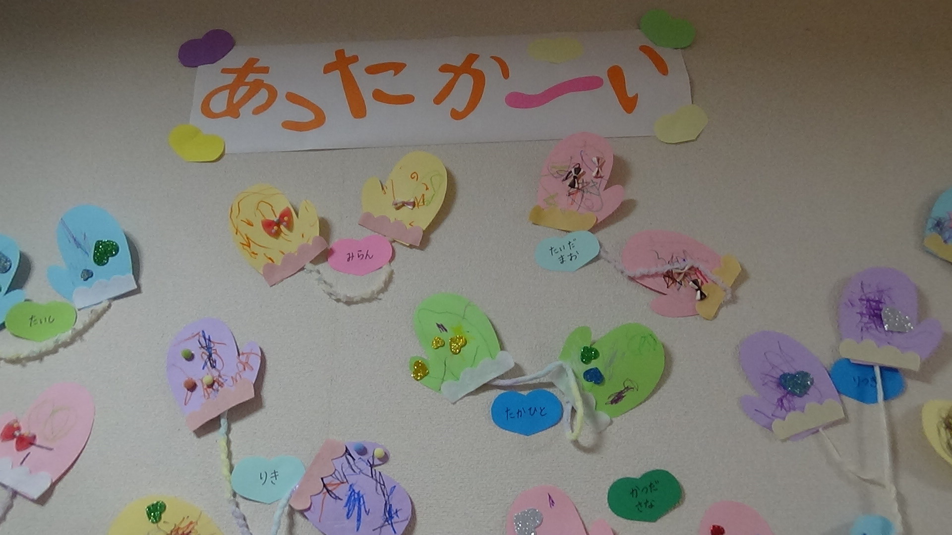 お正月にちなんだ『書初め』や『かるた』『丑』『だるま』やとっても寒いこの季節に欠かせない『あったか手袋』