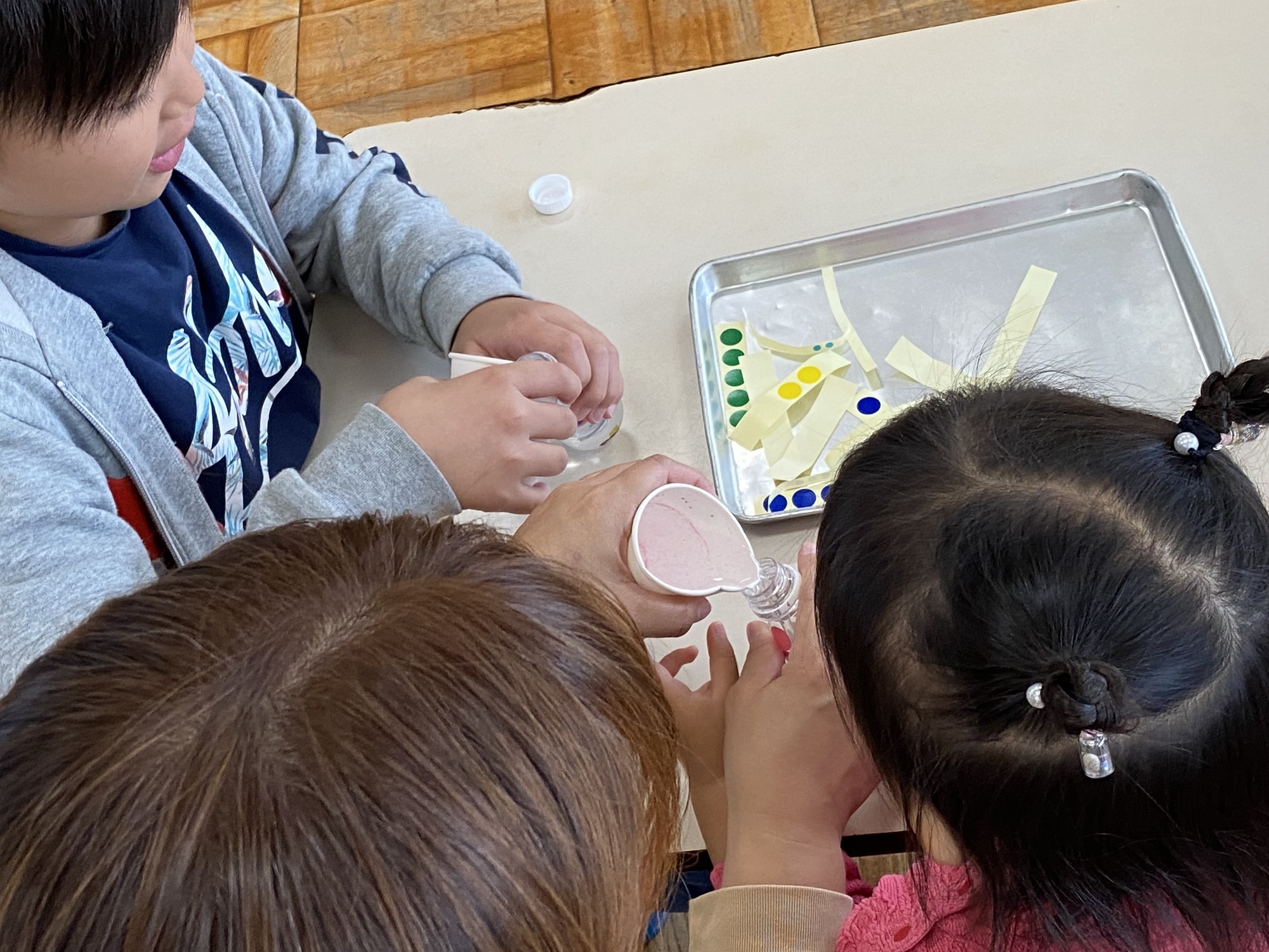 小さい容器にシール貼りを楽しみ、ボンボンや、スパンコールを入れて・・・