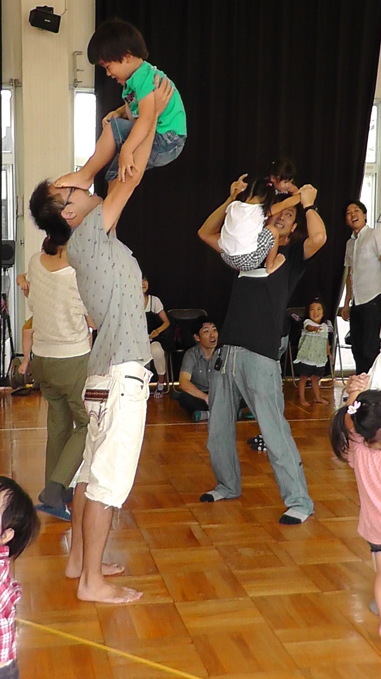 今日のひかりクラブは、『親子で触れ合い体操』 でした。 子どもたちは、ずっと動きっぱなし、お母さんお父さんも、お子様を引いたり、持ち上げたり、いい運動をされていました。よちよち歩けるくらいの小さなお子様から、大分活発に動ける3歳さんまで、来てくださいましたが、小さいお子様でも、子どもなりに自分の出来そうなこと、無理そうなことを本能的に判断して、参加したりしなかったりするんです。できると思ったことは、楽しそうにします。やりたいけど難しそうだから、手伝って〜とお母さんの手を引いていく子どももいます。やりたいけどできなさそうだ・・・と止めてしまう時でも、いいタイミングで「一緒にやろうか」と補助してあげると、やる気になることも多いです。できるだけ、成功体験を増やしていくためにも、無理強いせず、うまく声かけをしてトライする気にさせるといいですね。