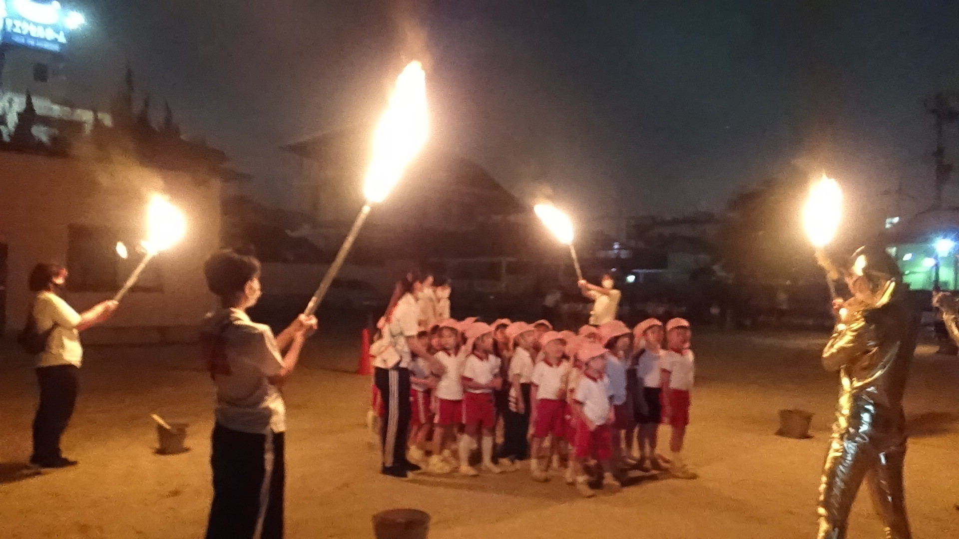 この日のために作っておいた提灯を魔除けに、幼稚園を探検に出かけます。