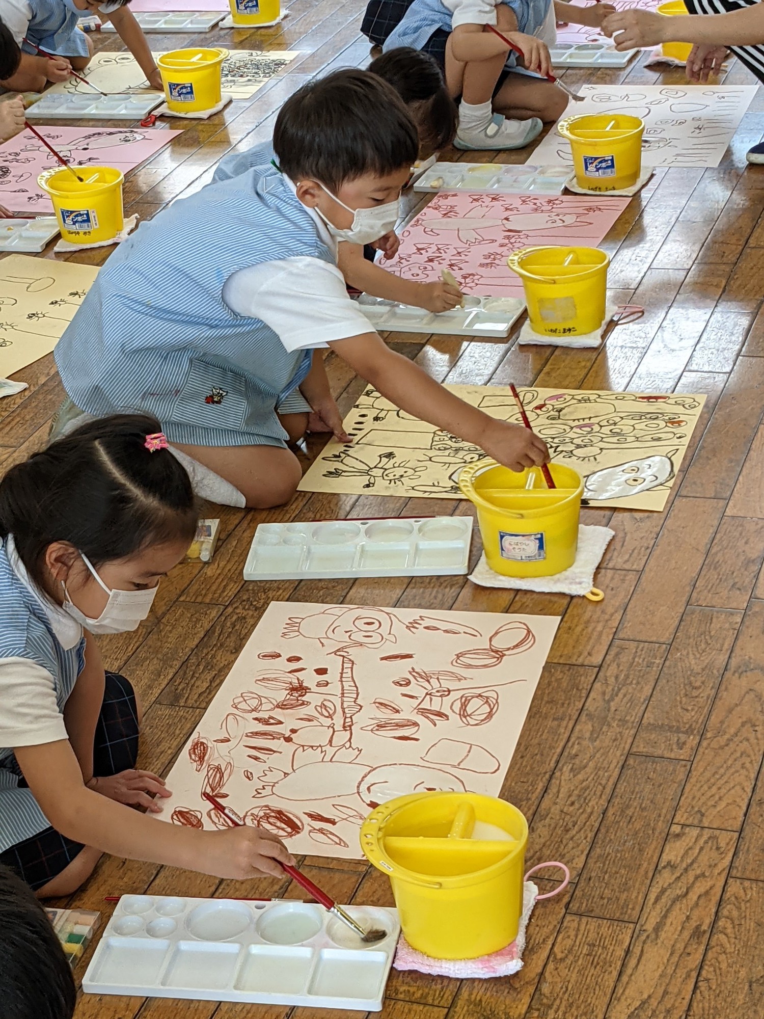 先生方は、その活動に入るまでの導入によって、子どもたちの興味関心、やる気を引き上げて、楽しい絵画の時間を作っていました。