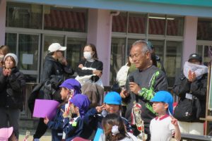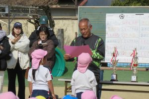 トロフィーと賞状を代表のお友だちがもらい、
