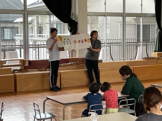 大型絵本「はらぺこあおむし」ではいろいろな食べ物が出てきて、子どもたちも口ずさみながら真剣に見ていました(*^^*)