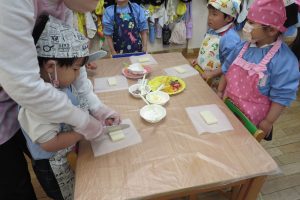 「フルーツサンド」は、先生と一緒にパンをカットして、