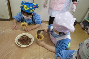 そして、給食室で冷やし固めて、またまたトッピングです。