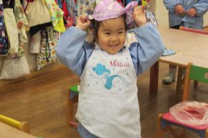 お家から持ってきた、エプロン・三角巾・マスクを自分でがんばります。