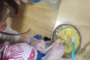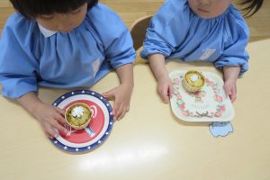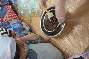 そして、給食室で冷やし固めて、またまたトッピングです。