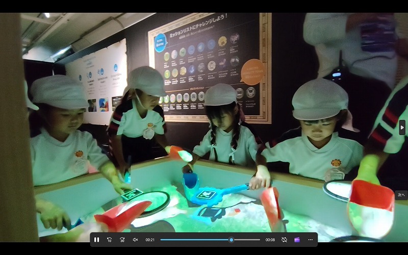 大きい映像で未来の街を見て、きれい~!かっこいい! ここに住みたい~!と反応していました。