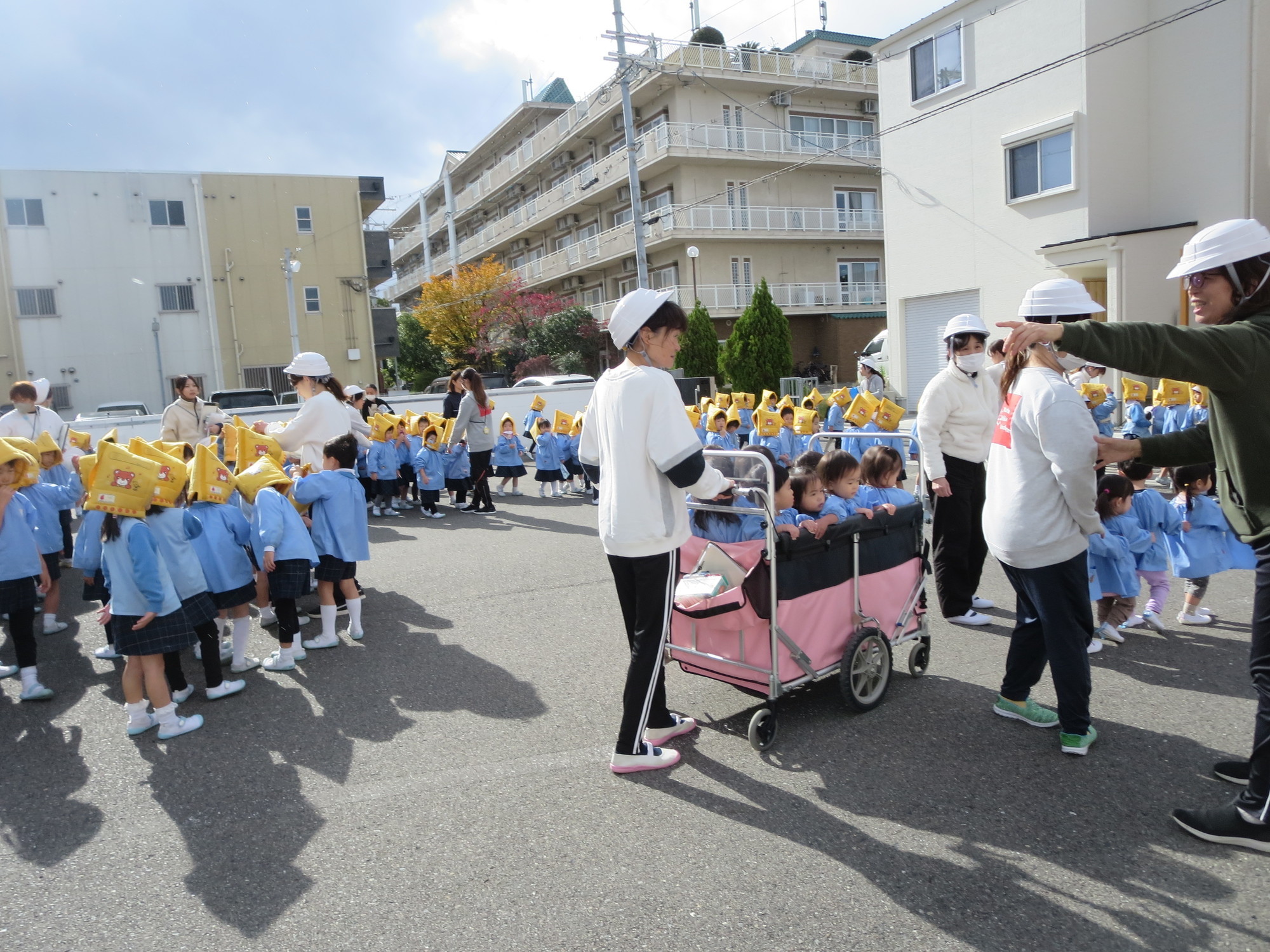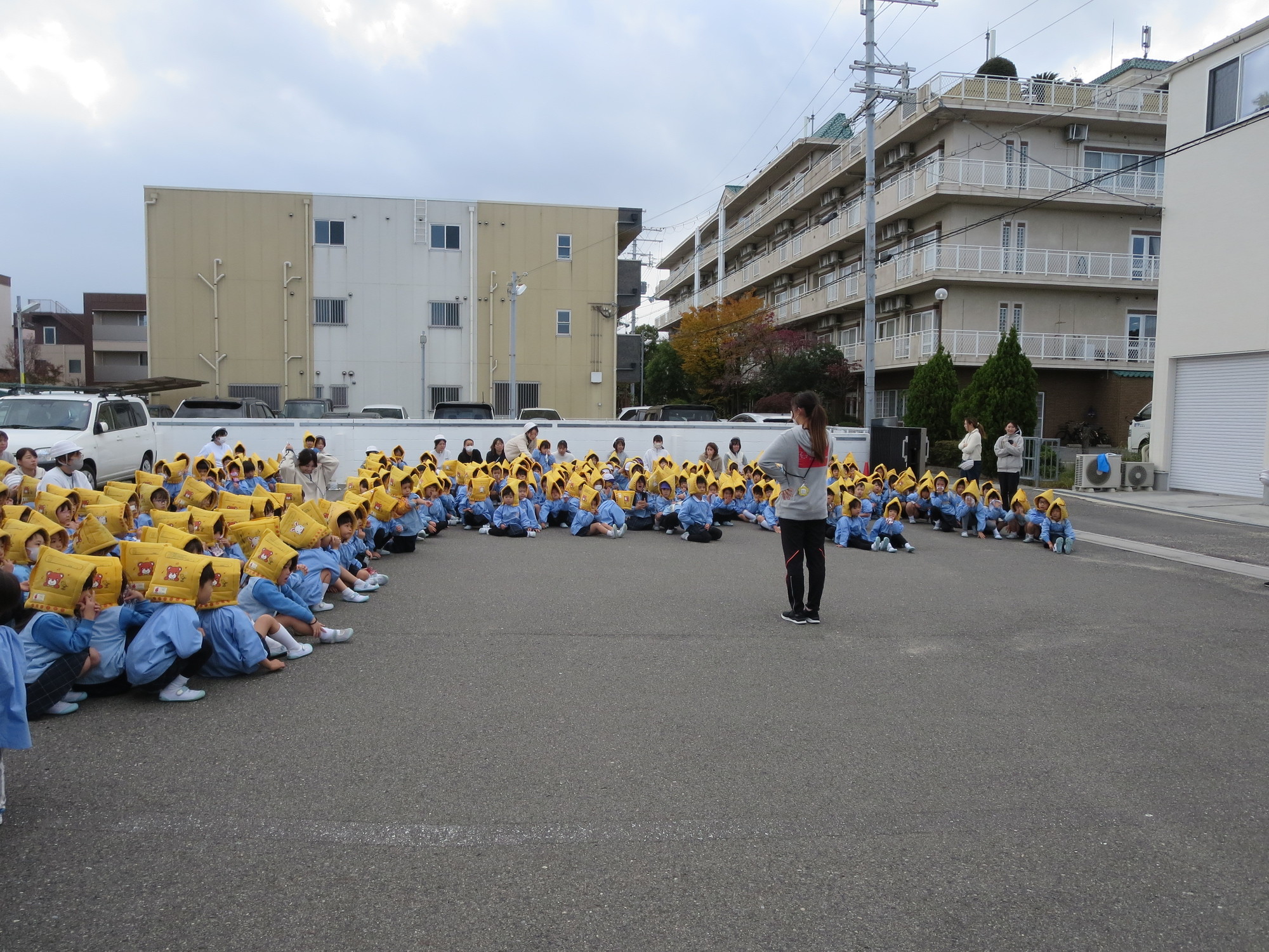 防災頭巾を被り、先生の話を聞いて、