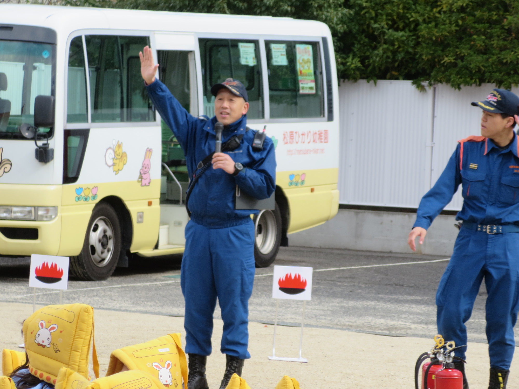 今日は、いつもの避難訓練を消防士さんにみていただきました。