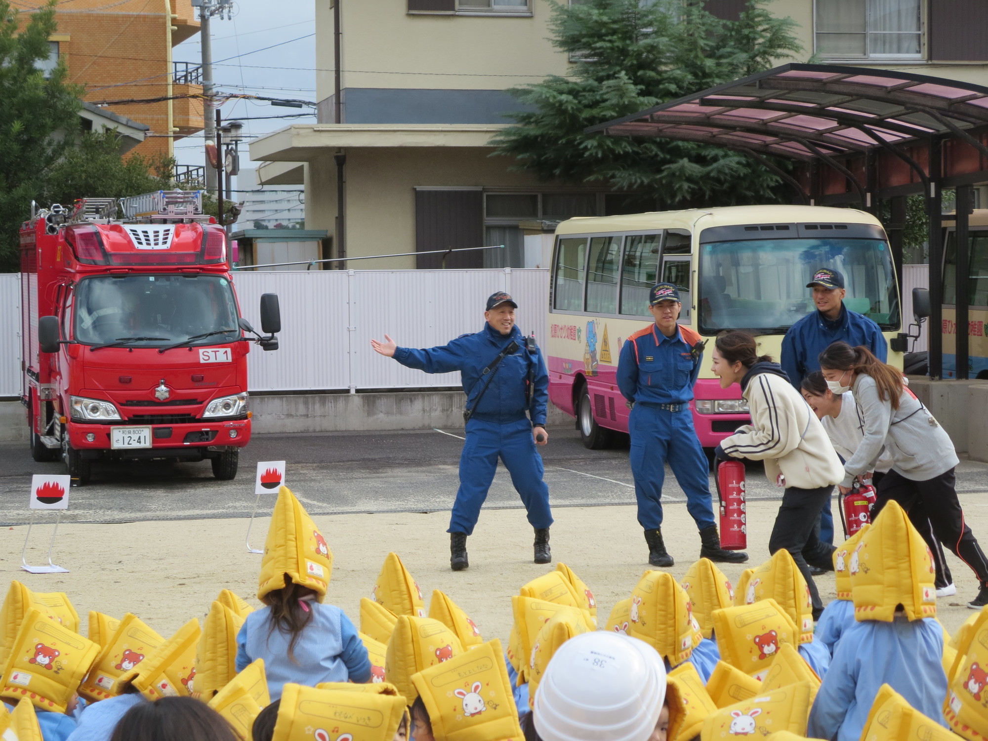 そのことを覚えて、先生たちが水消火器を使って、