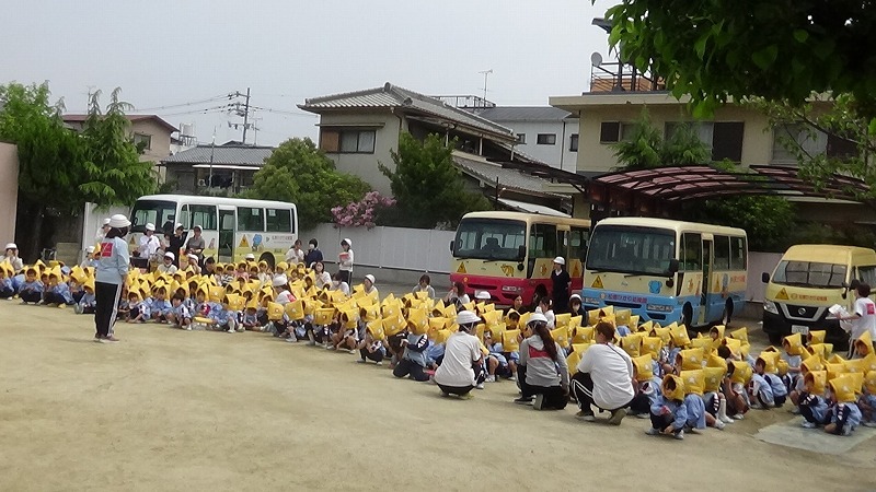 皆は、園庭に避難することになりました。
