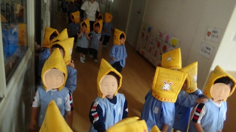 年少組さんは、防災頭巾をかぶって、ちょっと嬉しそう(#^^#)?