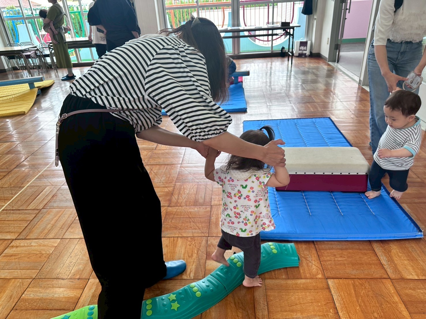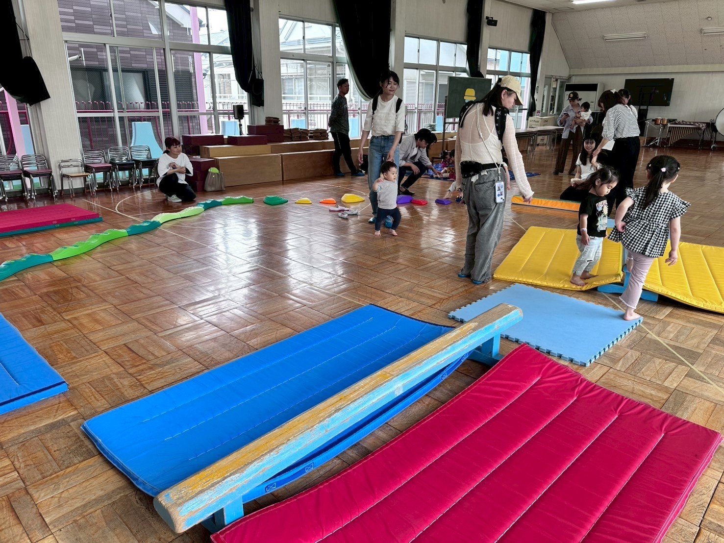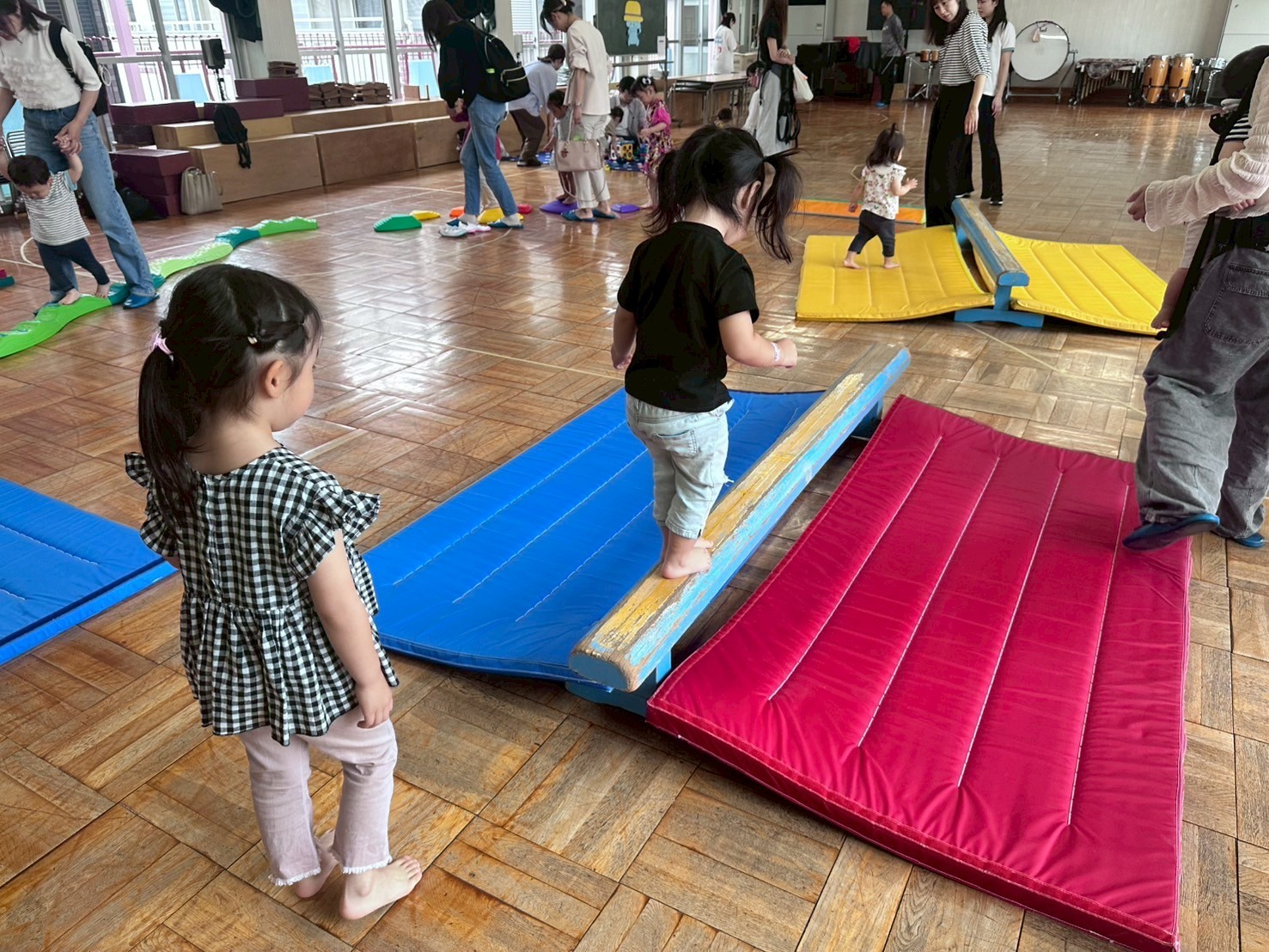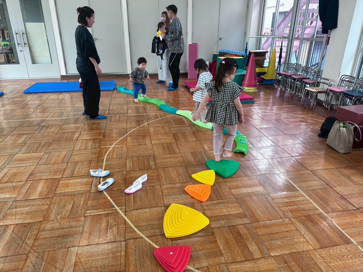 雨が降っていたので、ホールでサーキットを楽しみました。平均台や滑り台たくさん体を動かしました。
