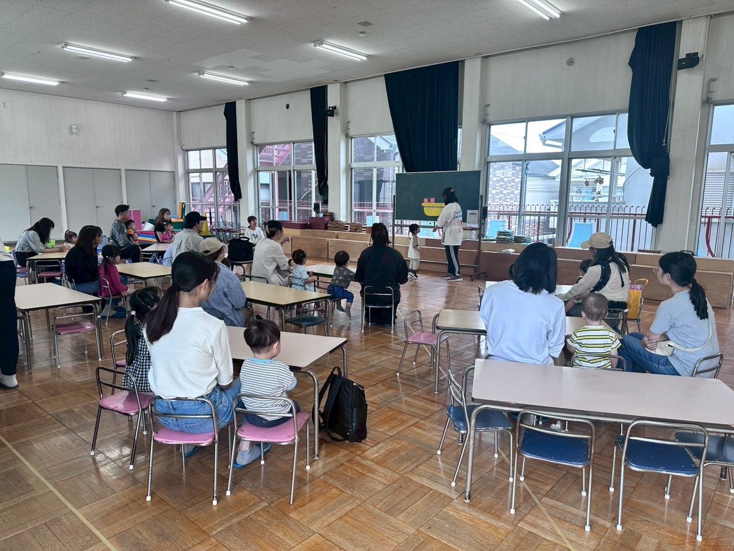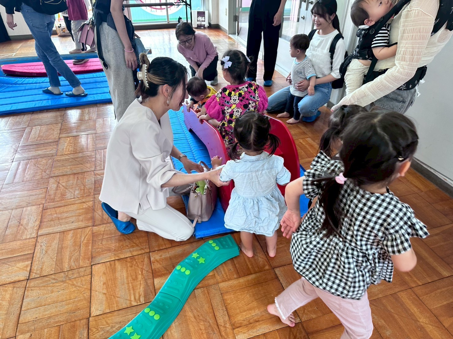 朝から雨が降っていましたがニコニコで遊びにきてくれた子どもたち。幼稚園に来たお友だちからホールでおもちゃをして遊びました。まずは、体を動かして「どうぶつ列車」をみんなでしましたよ。