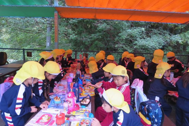今日は曇り空でしたが、雨は降ってなく、 秋の遠足(お芋掘り・みかんがり)に行くことができました。 「