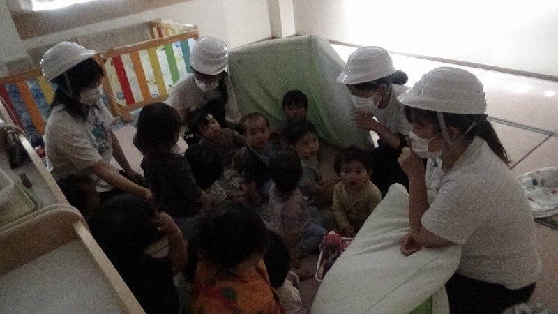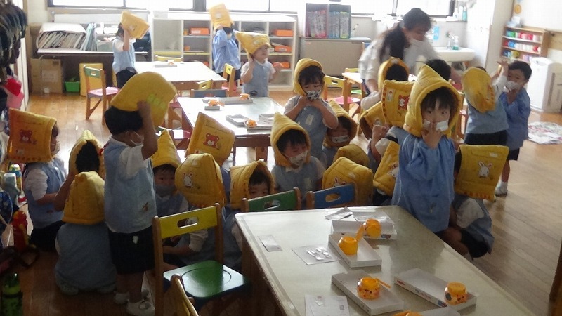 お部屋にいた幼児さんも、活動を中止して、防災頭巾をかぶって避難準備をします。
