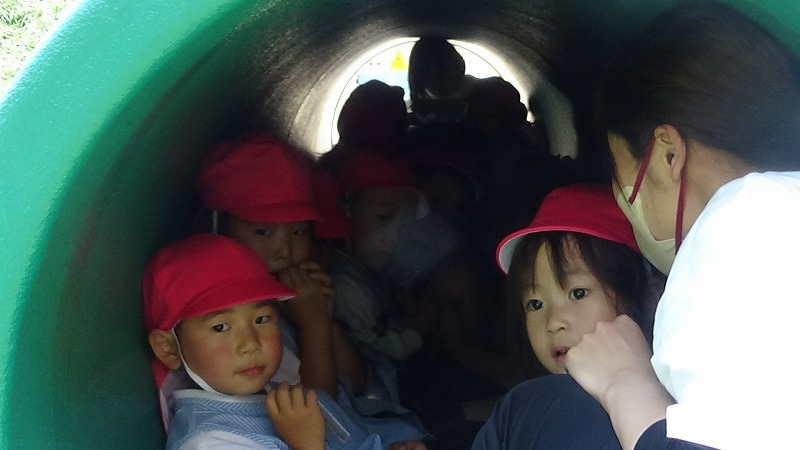 園庭で遊んでいる子どもたちは、園舎に戻ったクラスと築山のトンネルの中に潜入したクラス、両クラスとも動きはとても速やかで、ミサイルが通り過ぎるのを待っている時間もし~んと待機していました。