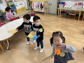 ぶら下がっている、ボンボリを力いっぱい羽子板風の板でついてくれました(^^♪