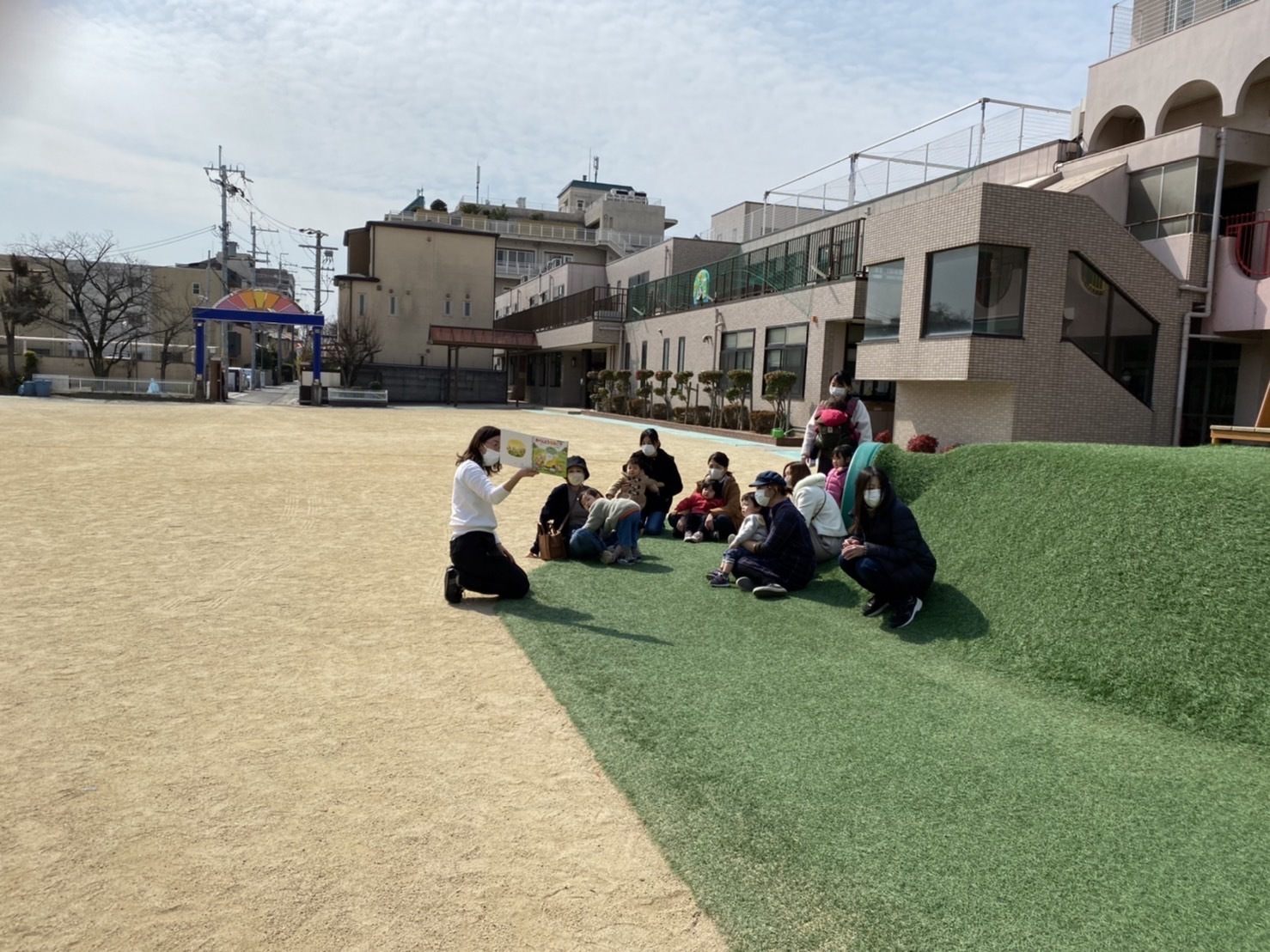 いつもは、お部屋で見る絵本を 今日は、芝生の所で読みました。
