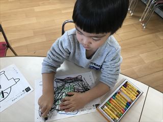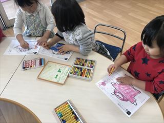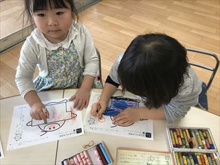 今日の1歳児クラスは、お雛様・お内裏様を土台に貼りつけ、好きな形の折り紙を貼りつけていきました☆