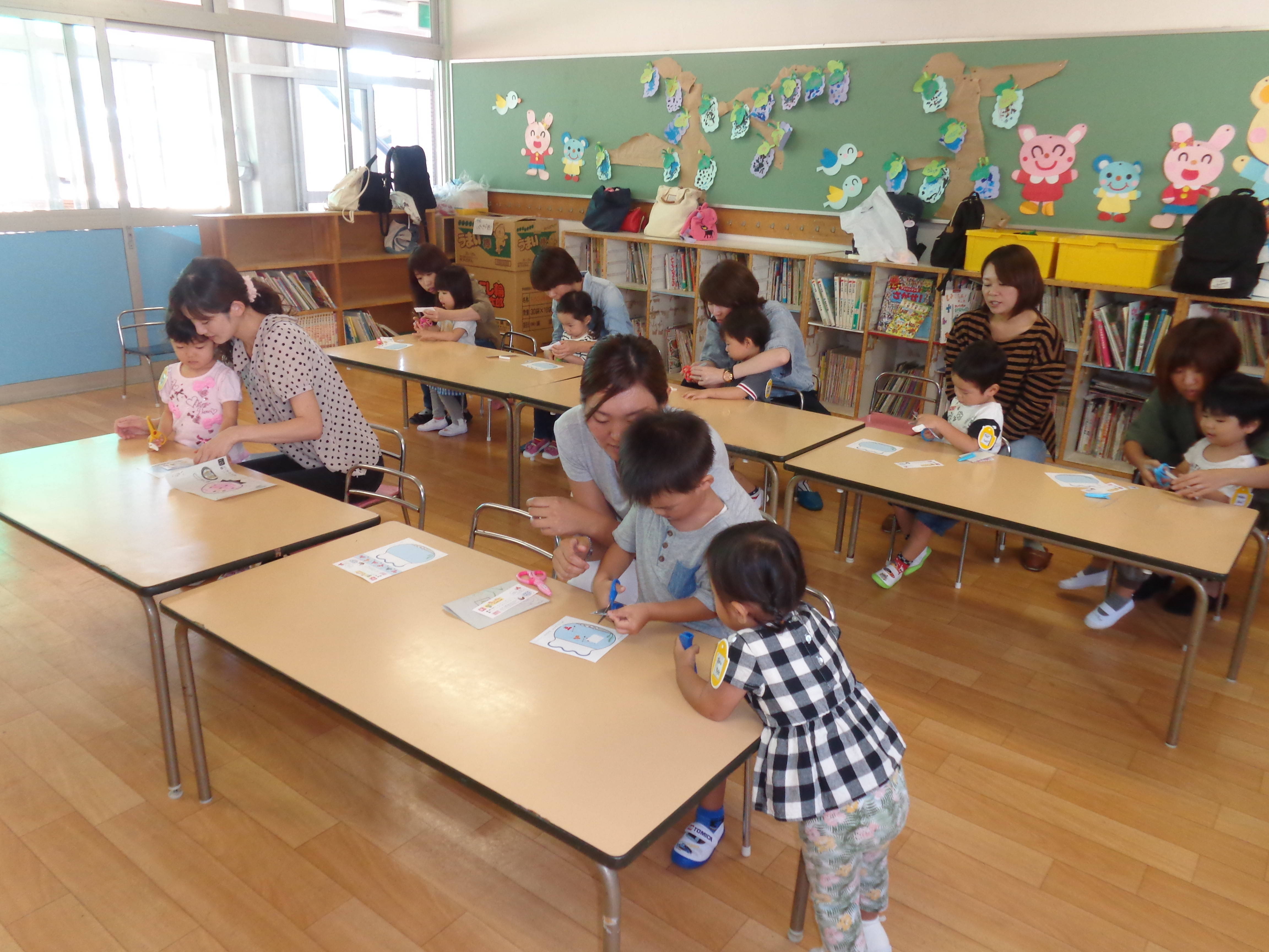 少しずつ、活動の中でお母さんから離れたり、お友達同士の関わりが持てるように言葉掛けています(^—^)
