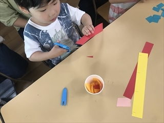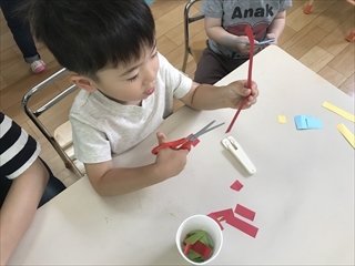 もうすぐ七夕なので、笹にみたてた緑の画用紙に、切った物を飾り付けていきました(^^♪