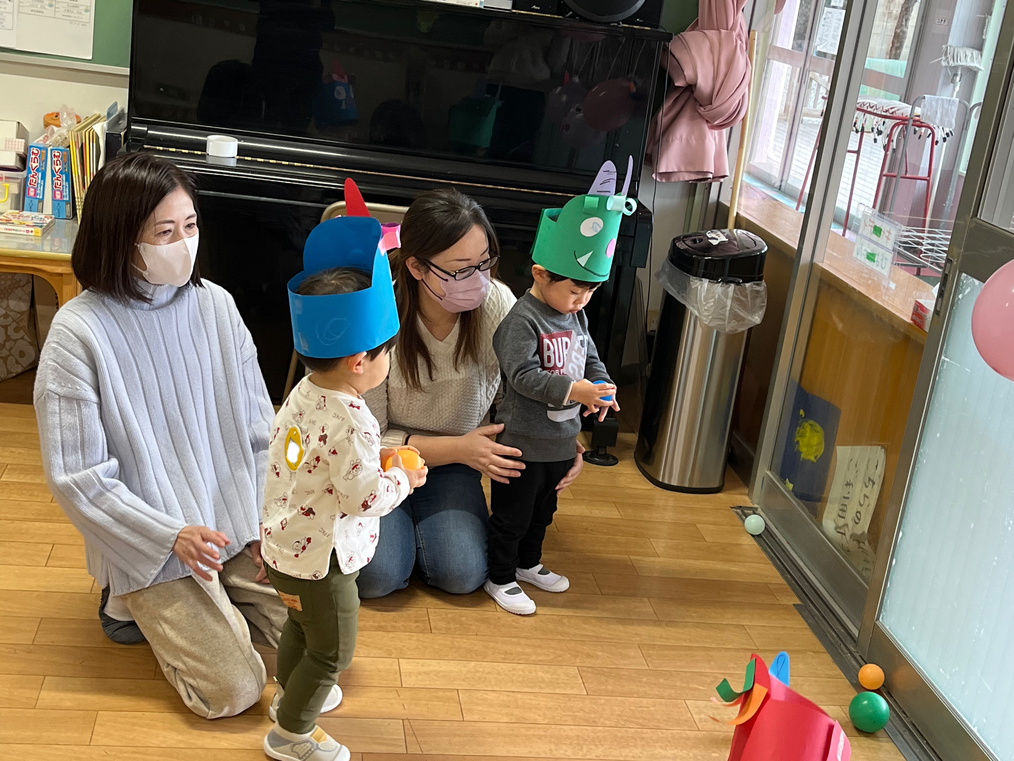豆の代わりのカラーボールを鬼さんめがけて「えいっ!」