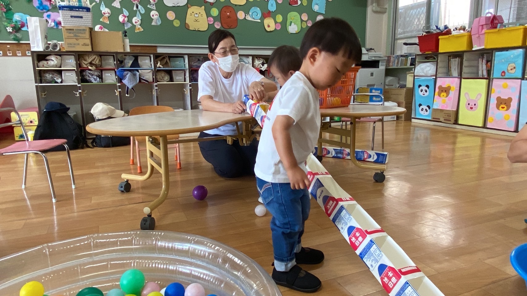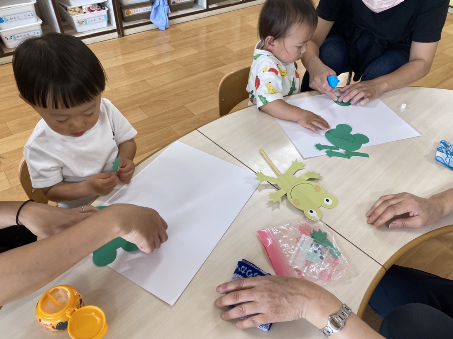 お名前をよばれて、ちょっぴり恥ずかしそうに手を上げてくれたり、お顔をじっとみてくれるようになって、仲良くなってきた感じがして、先生たちは、とっても嬉しいです。