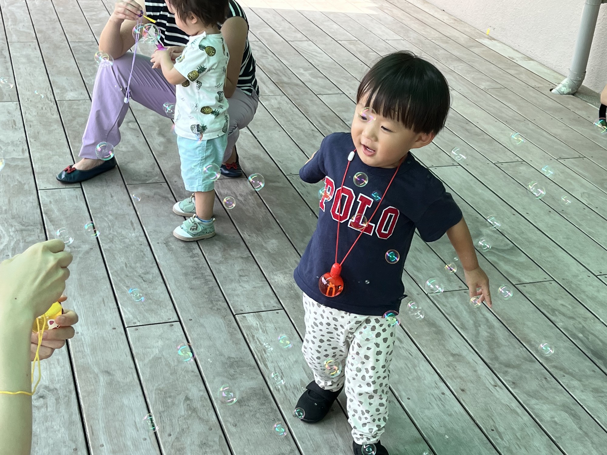 なかなか上手く吹けなかったんだけど、お母さんや先生がとばしてくれたシャボン玉をつかまえて面白かったね。