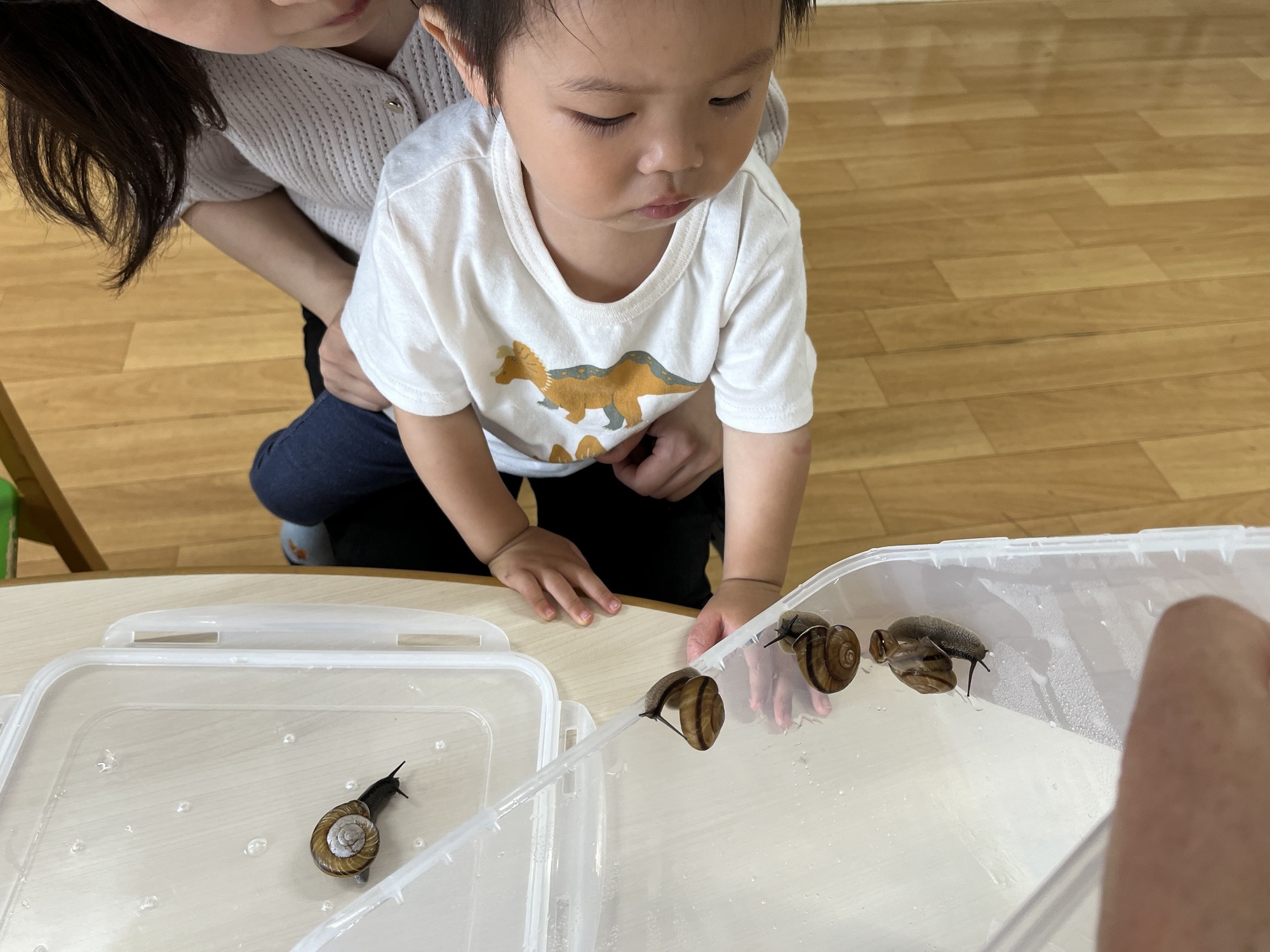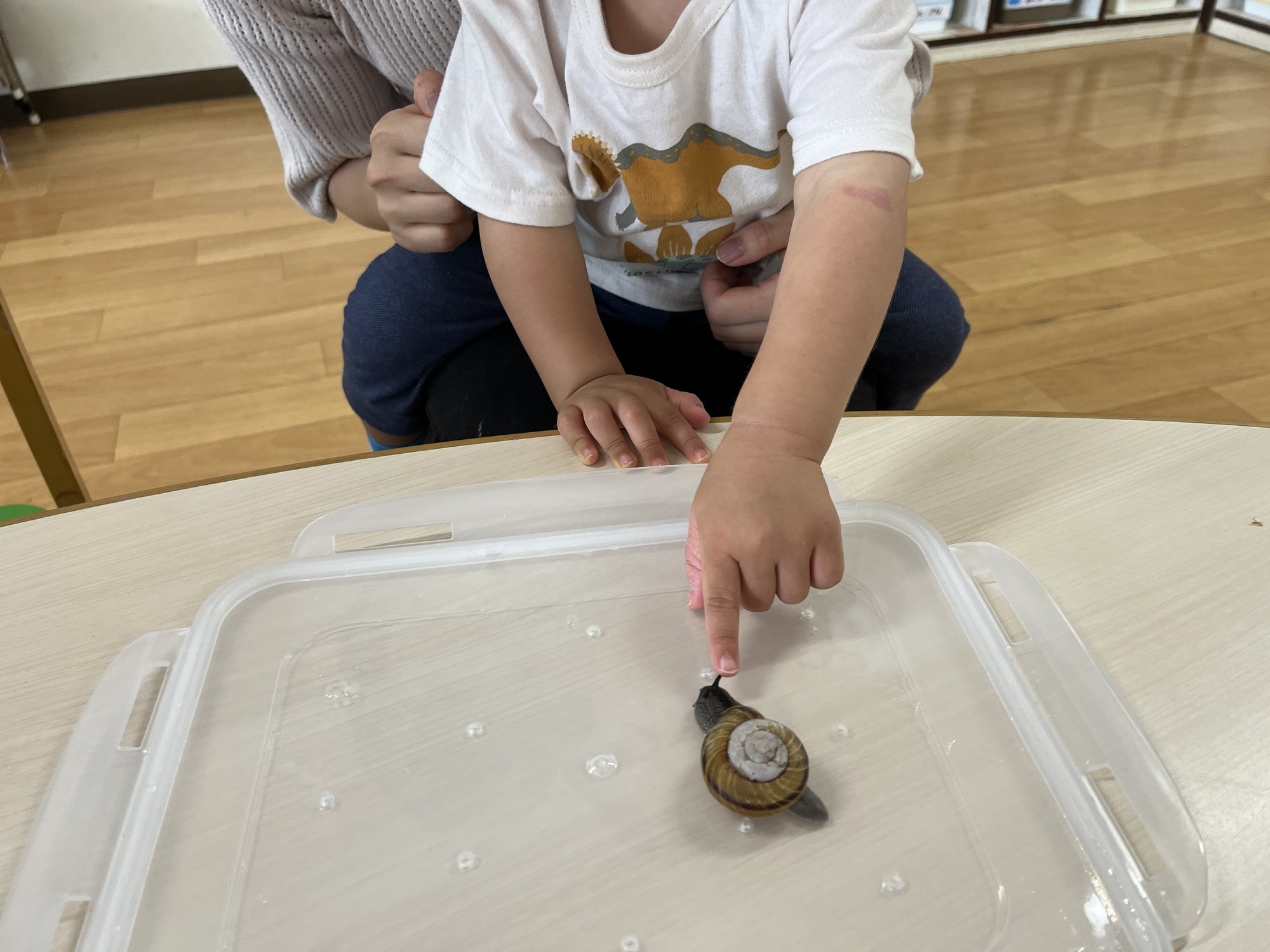初めて見るカタツムリにちょっと驚いたり、興味津々でじーっと見て、少し慣れてくると「ツノ」をそーっと触ったりもしました。