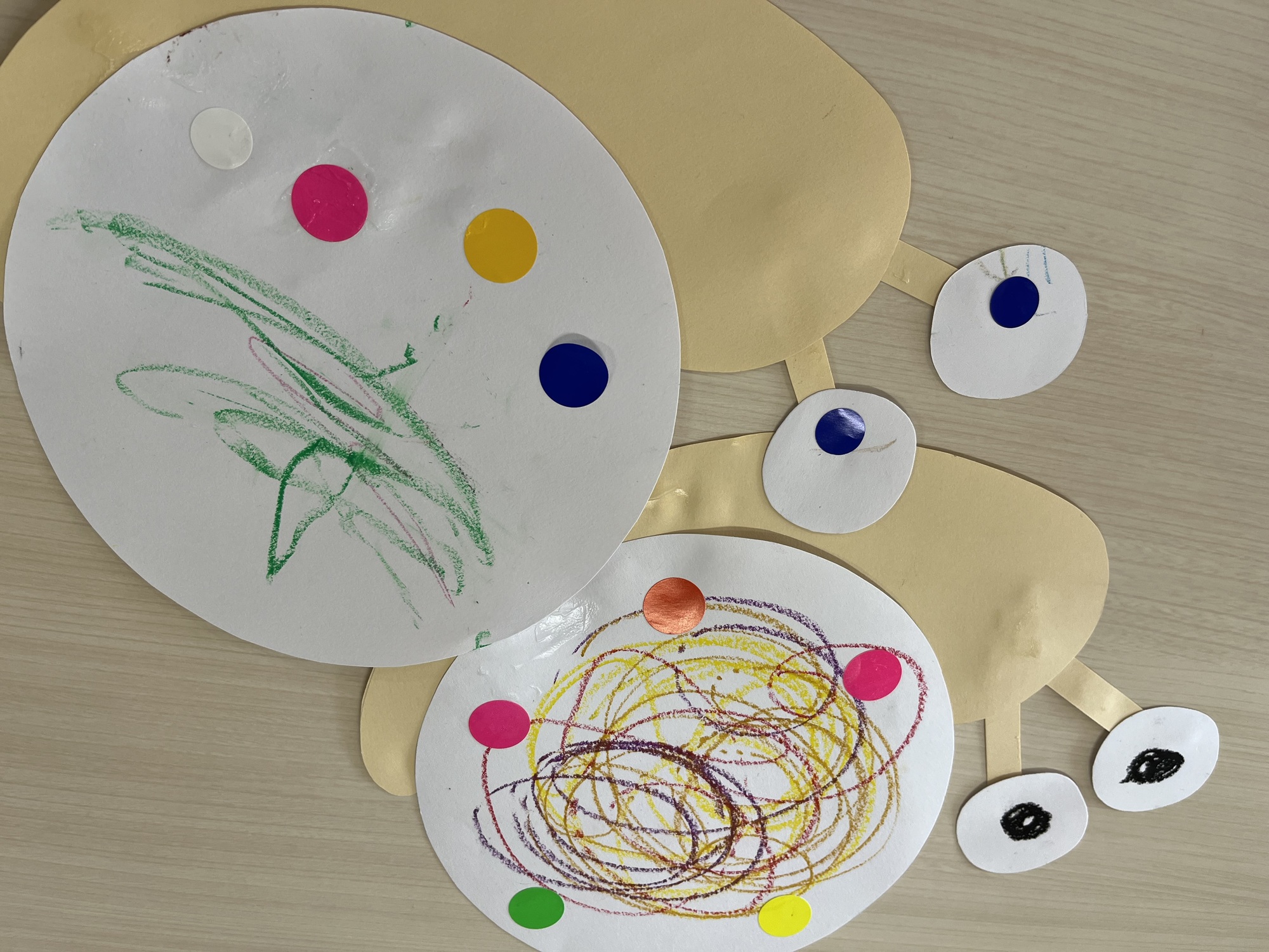クレパスでグルグル描いて、シールも貼って可愛いカタツムリの出来上がり