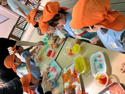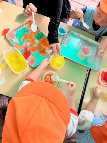 バットやプリンカップなどに入った寒天に興味津々のこどもたち!