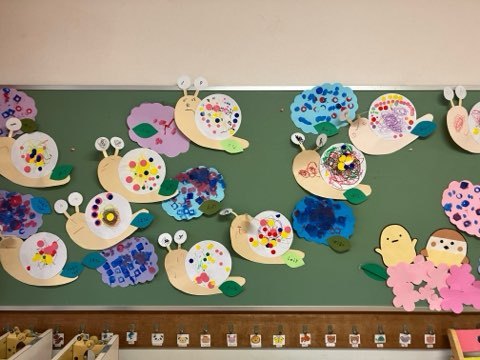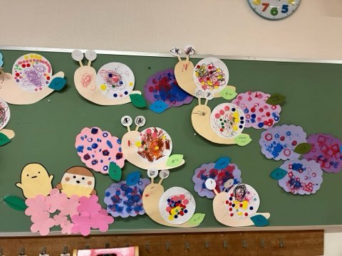 今日は前回みんなで作ったカタツムリさんに、アジサイの花をスタンピングで作って壁面に添えました★