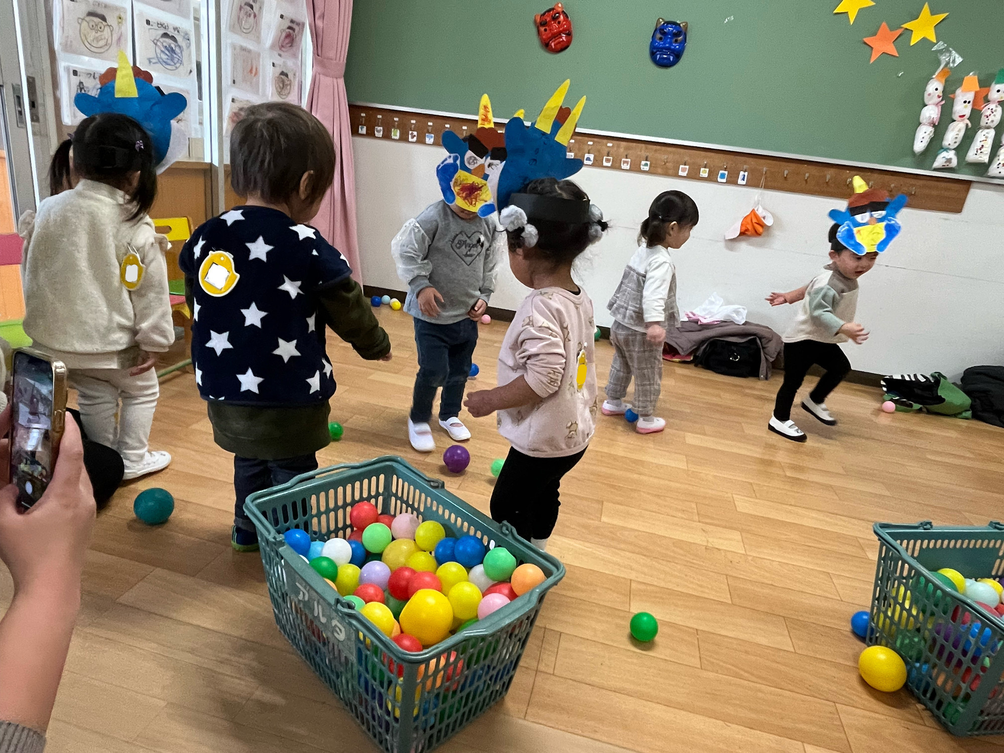出来上がった鬼さんのお面をつけて、豆まき開始!